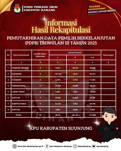 Pengumuman Penetapan Rekapitulasi Pemutakhiran Daftar Pemilih Berkelanjutan Kabupaten Sijunjung Provinsi Sumatera Barat Triwulan III Tahun 2025
