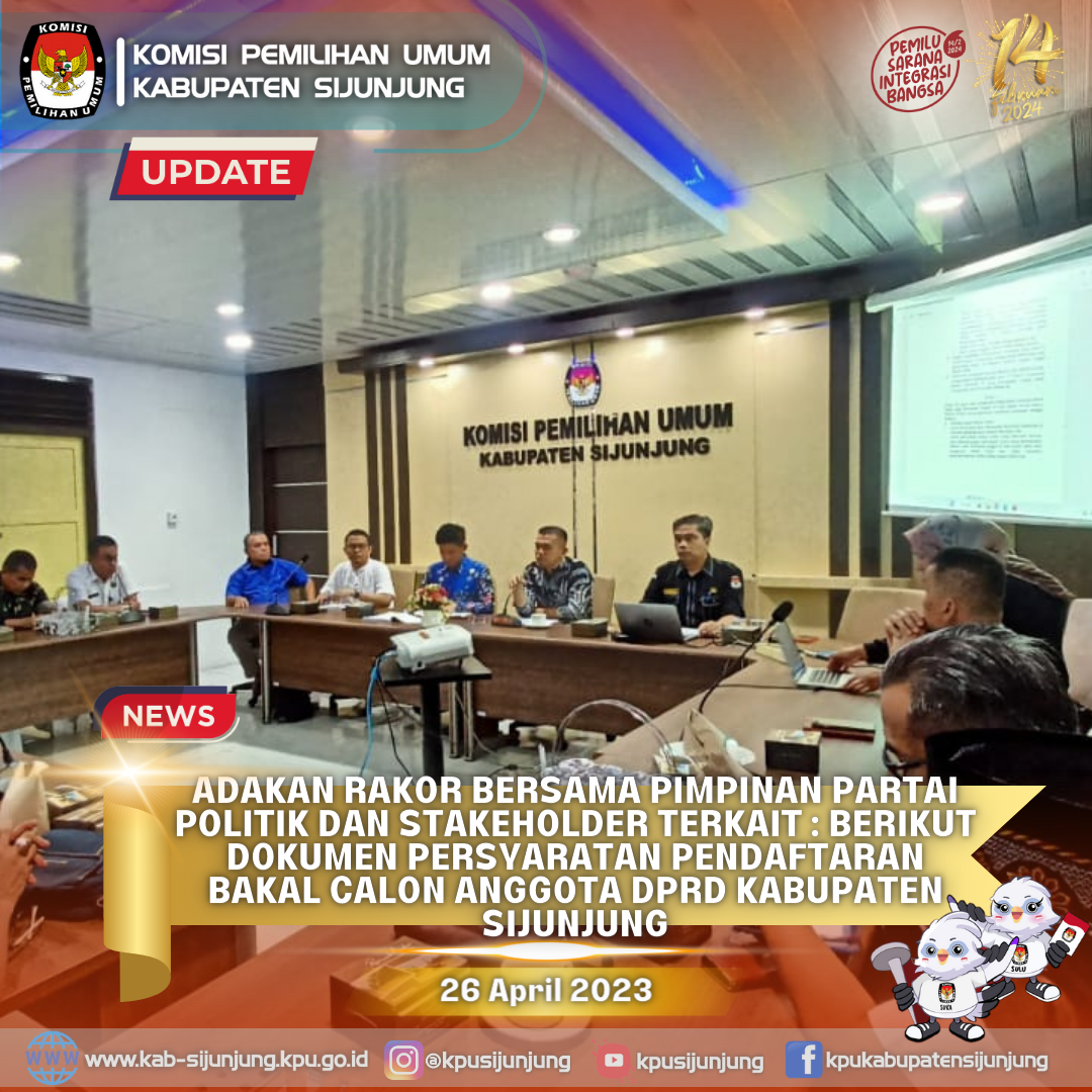Sijunjung - KPU Kabupaten Sijunjung mengadakan Rapat Koordinasi (RAKOR) dan Sosialisasi Persiapan Pendaftaran Pengajuan Bakal Calon Anggota DPRD Kabupaten Sijunjung pada Pemilu 2024, yang dihadiri oleh 18 Pimpinan Partai Politik peserta Pemilu, Polres, Dandim 0310 SSD, Pengadilan Negeri, Kejaksaan Negeri, Lembaga Permasyarakatan kelas II B Muaro, BNN Kota Sawahlunto, Kacabdin Wilayah V Dinas Pendidikan Sumatera Barat, Kantor Kementerian Agama Sijunjung, Dinas Kesehatan, Direktur RSUD Sijunjung, Kesbangpol Sijunjung dan Stakeholder terkait lainnya, di Aula kantor KPU Kabupaten Sijunjung Rabu (26/4/2023).