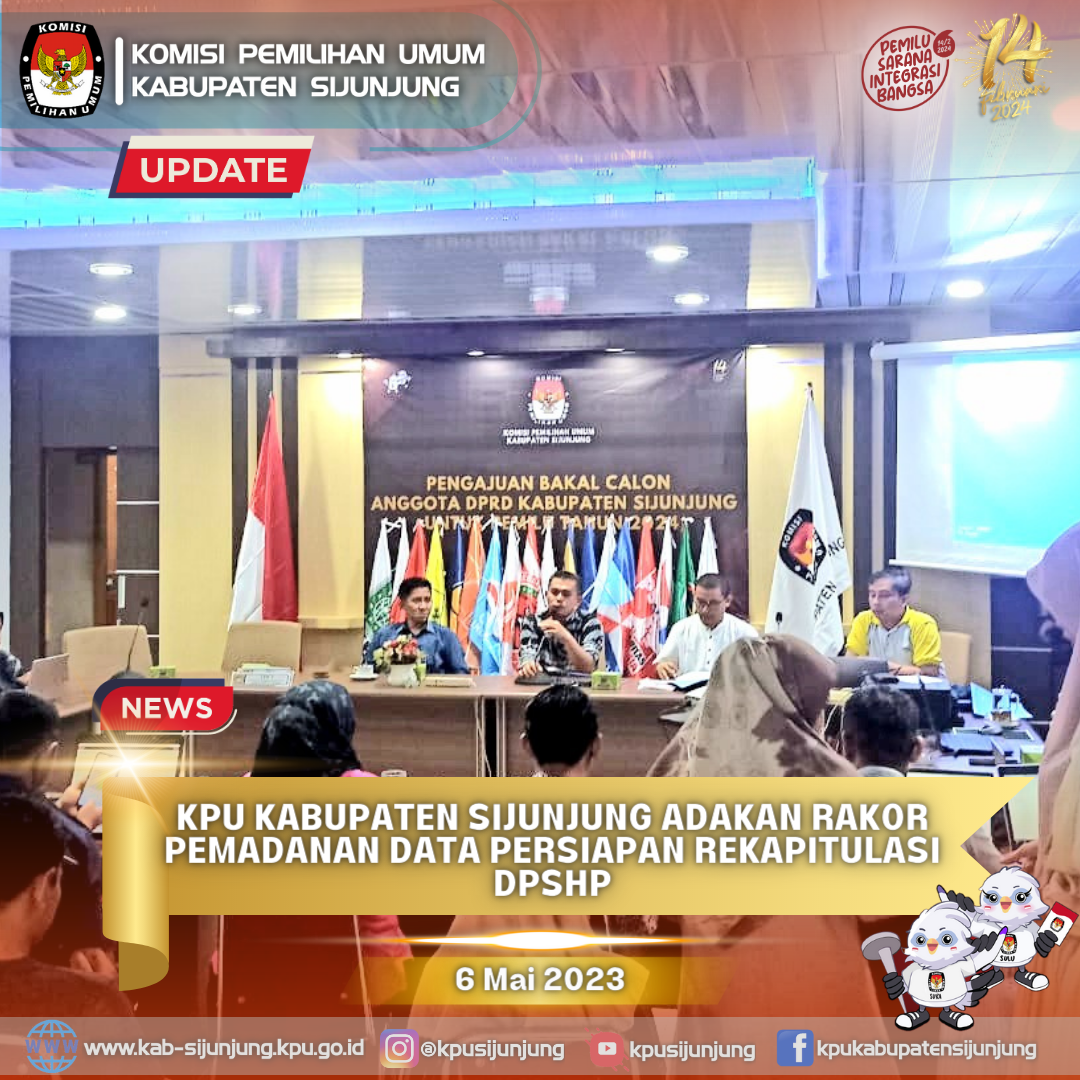 Sijunjung - KPU Kabupaten Sijunjung menggelar Rapat Koordinasi (RAKOR) Pemadanan Data Persiapan Rekapitulasi DPSHP (Daftar Pemilih Sementara Hasil Perbaikan), bersama Ketua dan operator SIDALIH PPK Se-Kabupaten Sijunjung, di aula kantor KPU Kabupaten Sijunjung, Sabtu (6/5/2023).