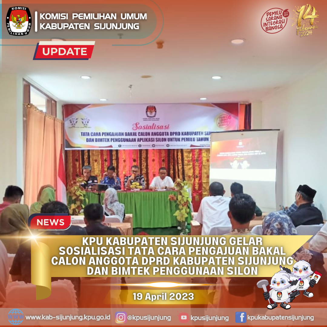 Sijunjung- KPU Kabupaten Sijunjung menggelar sosialisasi Tata Cara Pengajuan Bakal Calon Anggota DPRD Kabupaten Sijunjung dan Bimtek Penggunaan Aplikasi Sistem Informasi Pencalonan (SILON) Untuk Pemilihan Umum Tahun 2024 yang dilaksanakan di Hotel Bukik Gadang, Rabu (19/4/2023). Rapat dihadiri oleh Jajaran KPU Kabupaten Sijunjung, PARPOL dan BAWASLU.