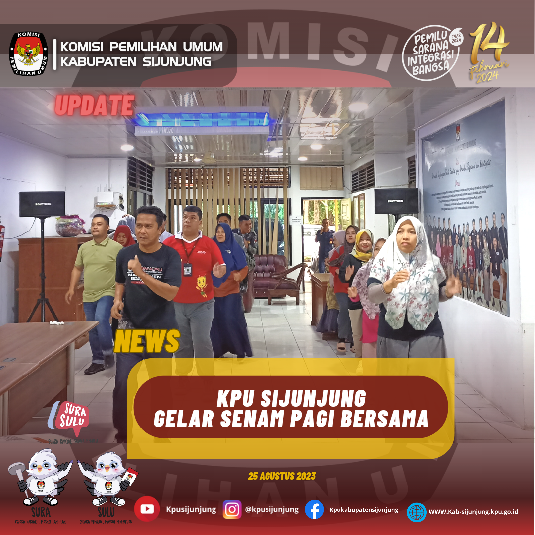 Kegiatan Senam ini berdasarkan surat Sekjen No 2963/SDM.07.1-SD/04/2023 tanggal 8 Agustus 2023 Perihal Pelaksanaan Olahraga Pada Hari Jumat untuk itu KPU Kabupaten Sijunjung melaksanakan senam pagi yang dimulai pada pukul 08:00 WIB, maksud dan tujuan senam ini adalah untuk menjaga kesehatan seluruh pegawai KPU Kabupaten Sijunjung serta menunjang produktivitas dan optimalisasi kinerja.