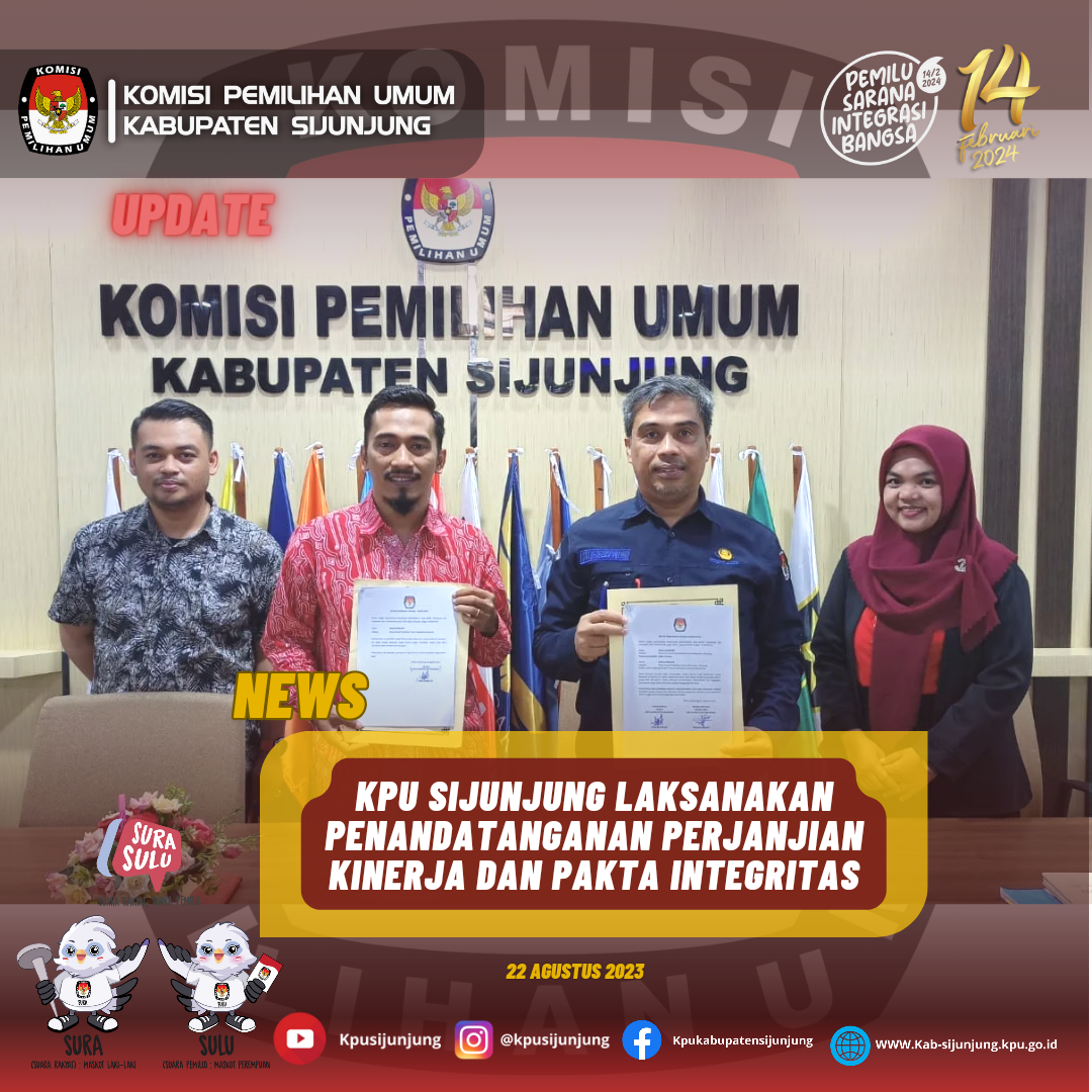 Penandatanganan Perjanjian Kinerja dan Pakta Integritas ini dilakukan oleh Ketua KPU Kabupaten Sijunjung Dori Kurniadi dan Sekretaris KPU Kabupaten Sijunjung Irzal Zamzami, dengan disaksikan langsung oleh Anggota KPU Kabupaten Sijunjung Bayu Agung Perdana, Ria Meilani serta Pegawai Sekretariat KPU Kabupaten Sijunjung.