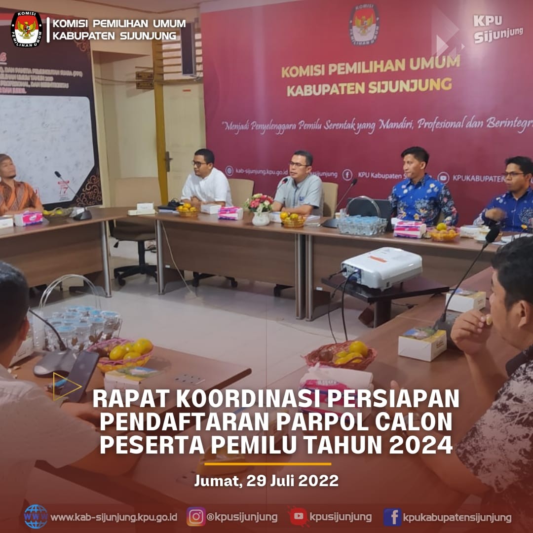 Pasca menghadiri Bimbingan Teknis Peraturan KPU Nomor 4 Tahun 2022 dan Perkenalan Sistem Sipol di Hotel Grand Mercure Harmoni, Jakarta (23 s/d 25 Juli 2022) yang dilaksakan oleh KPU Republik Indonesia untuk seluruh KPU Provinsi dan KPU Kabupaten/Kota se-Indonesia, KPU Sijunjung menindaklajuti hal tersebut dengan mengadakan rapat koordinasi (rakor) persiapan pendaftaran, verifikasi dan penetapan partai politik calon Peserta Pemilihan Umum Tahun 2024. Rakor dilaksanakan di ruangan media center kantor KPU Sijunjung pada hari Jumat (29/7).