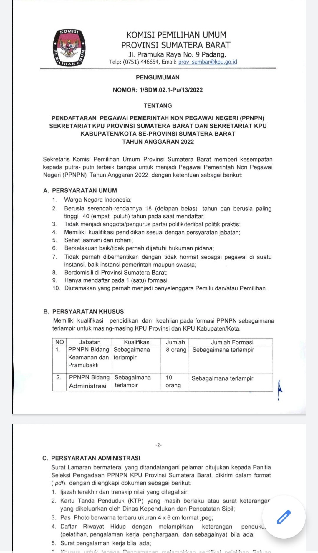 Pendaftaran Pegawai Pemerintah Non Pegawai Negeri (PPNPN) Sekretariat KPU Provinsi Sumatera Barat dan Sekretariat KPU Kabupaten/Kota Se-Provinsi Sumatera Barat Tahun Anggaran 2022