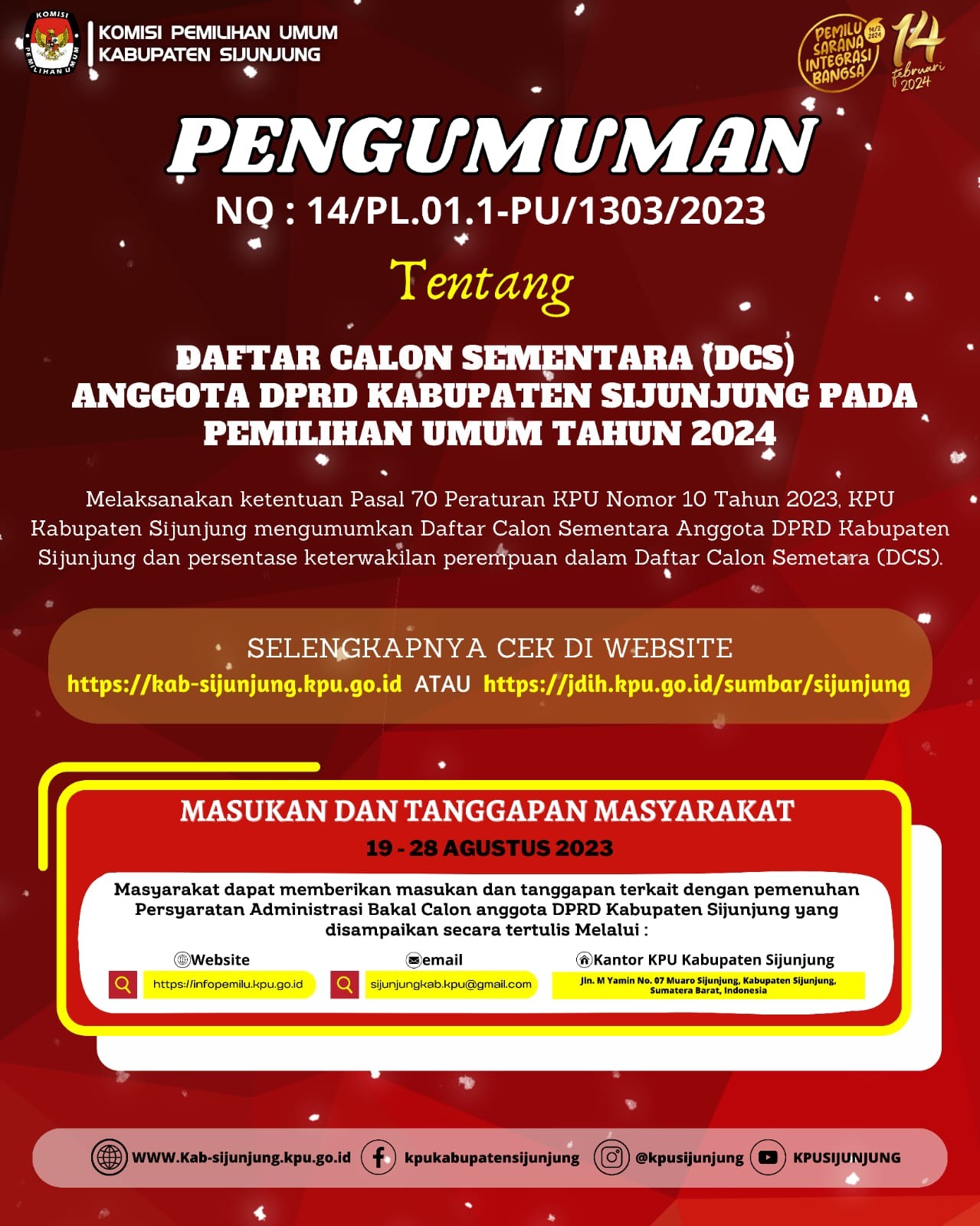 - Pengumuman Nomor 14/PL.01.1-PU/1303/2023 Tentang Daftar Calon Sementara Anggota Dewan Perwakilan Rakyat Daerah Kabupaten Sijunjung Dalam Pemilihan Umum Tahun 2024.