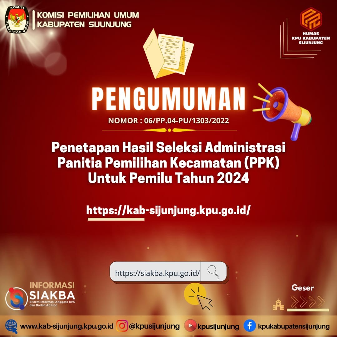 KPU Kabupaten Sijunjung Menetapkan Hasil Seleksi Administrasi Panitia Pemilihan Kecamatan (PPK) Kabupaten Sijunjung Dalam Pemilihan Umum Tahun 2024, yang ditetapkan dalam rapat pleno pada Tanggal 1 Desember 2022 dengan nomor Berita Acara : 1O3/PK.01-BA/13O3|2O22 tanggal 01 Desember 2022 tentang Rapat Pleno Penetapan Hasil Seleksi Administrasi Panitia Panitia Pemilihan Kecamatan (PPK) Pemilu Tahun 2024, Hasil tersebut dituangkan dalam Pengumuman Nomor : 06/PP.04-PU/1303.2022 yang dapat di Download dibawah ini: