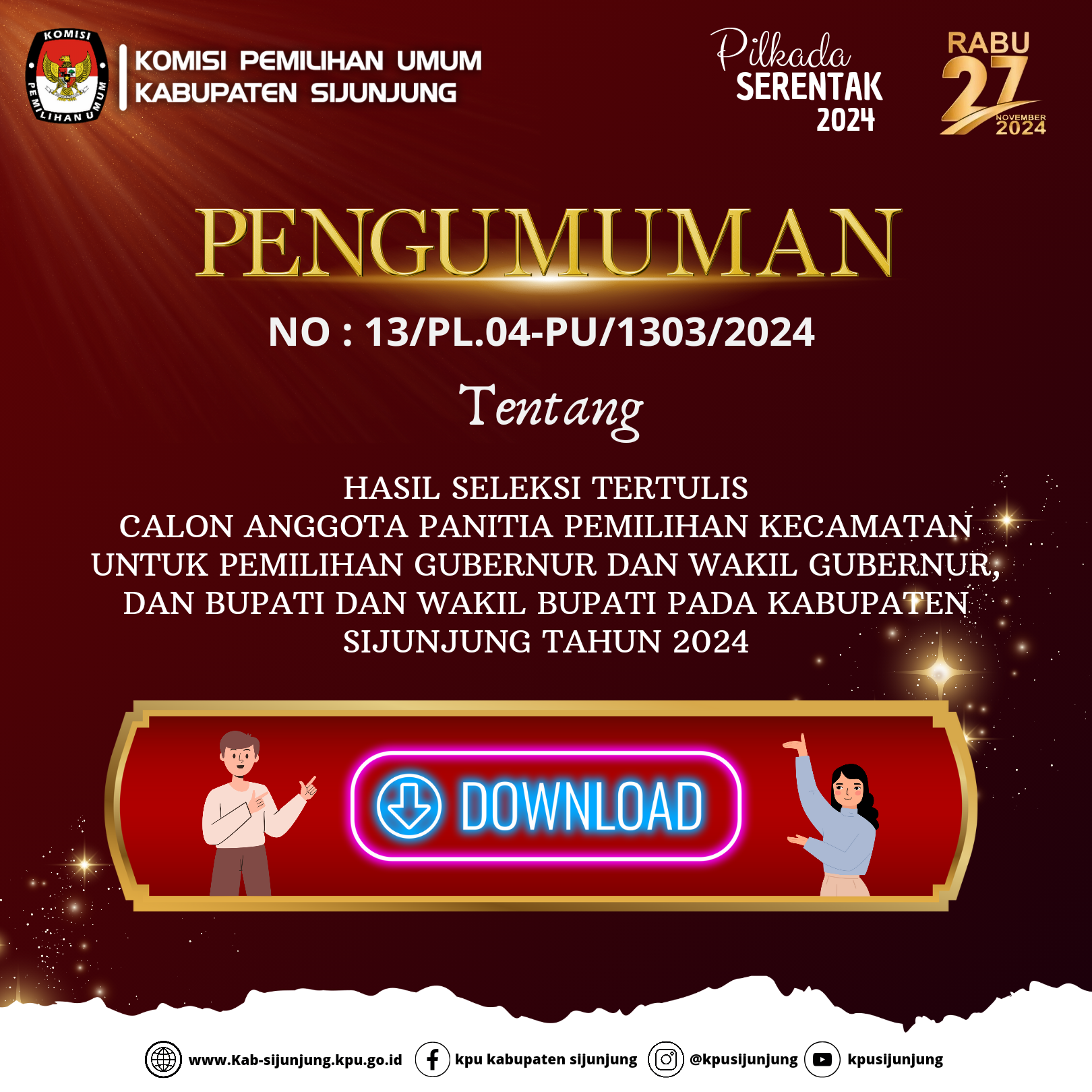 PENGUMUMAN HASIL SELEKSI TERTULIS CALON ANGGOTA PANITIA PEMILIHAN KECAMATAN UNTUK PEMILIHAN GUBERNUR DAN WAKIL GUBERNUR, DAN BUPATI DAN WAKIL BUPATI PADA KABUPATEN SIJUNJUNG TAHUN 2024