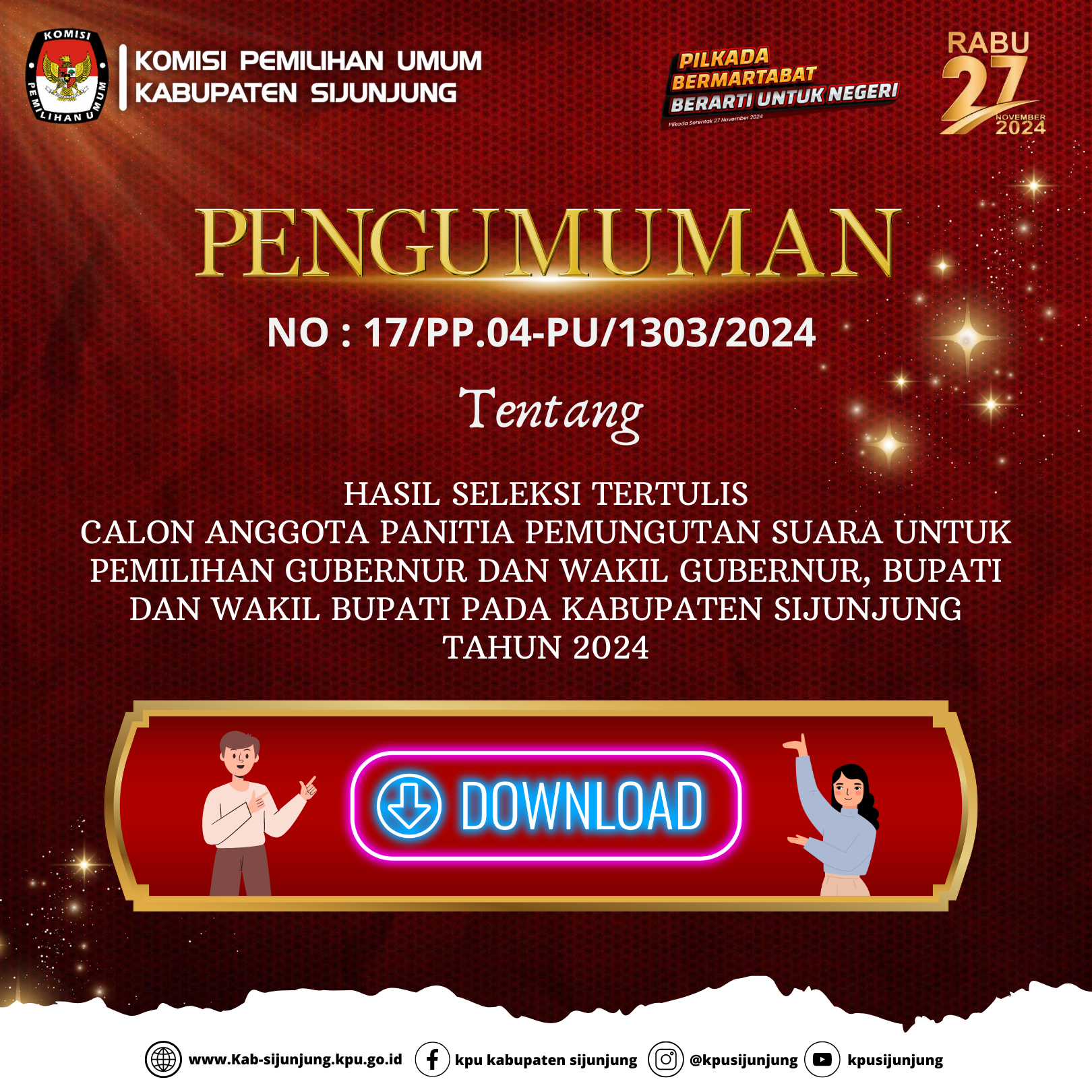PENGUMUMAN HASIL SELEKSI TERTULIS CALON ANGGOTA PANITIA PEMUNGUTAN SUARA UNTUK PEMILIHAN GUBERNUR DAN WAKIL GUBERNUR, BUPATI DAN WAKIL BUPATI PADA KABUPATEN SIJUNJUNG TAHUN 2024