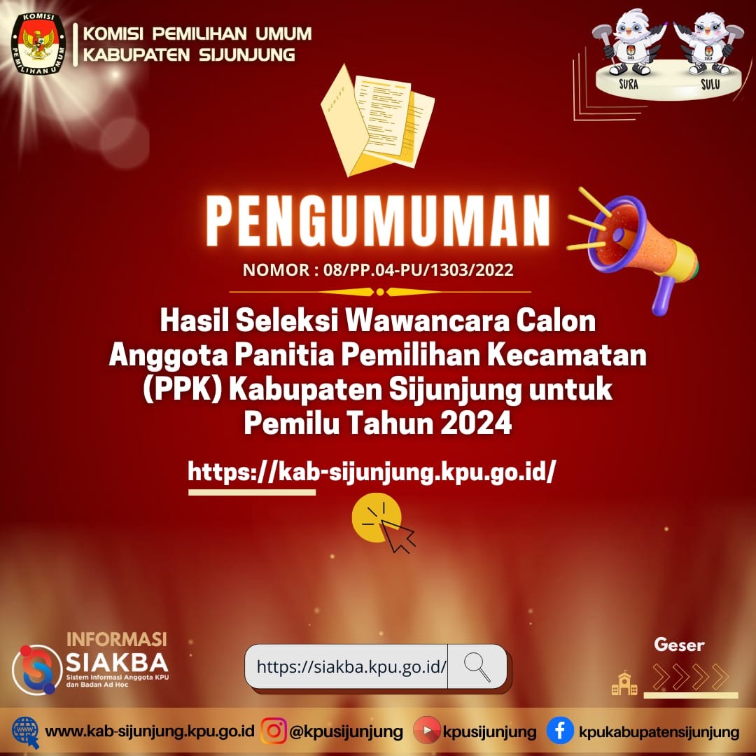 KPU Kabupaten Sijunjung Mengumumkan Hasil Seleksi Wawancara Calon Anggota Panitia Pemilihan Kecamatan (PPK) Kabupaten Sijunjung Dalam Pemilihan Umum Tahun 2024. Ditetapkan dalam rapat pleno pada Tanggal 13 Desember 2022 dengan nomor Berita Acara : 116/PK.01-BA/13O3|2O22 tanggal 13 Desember 2022 tentang Rapat Pleno Penetapan Hasil Wawancara Calon Anggota Panitia Panitia Pemilihan Kecamatan (PPK) Pada Pemilu Tahun 2024, Hasil tersebut dituangkan dalam Pengumuman Nomor : 08/PP.04-PU/1303.2022 yang dapat di Download dibawah ini: