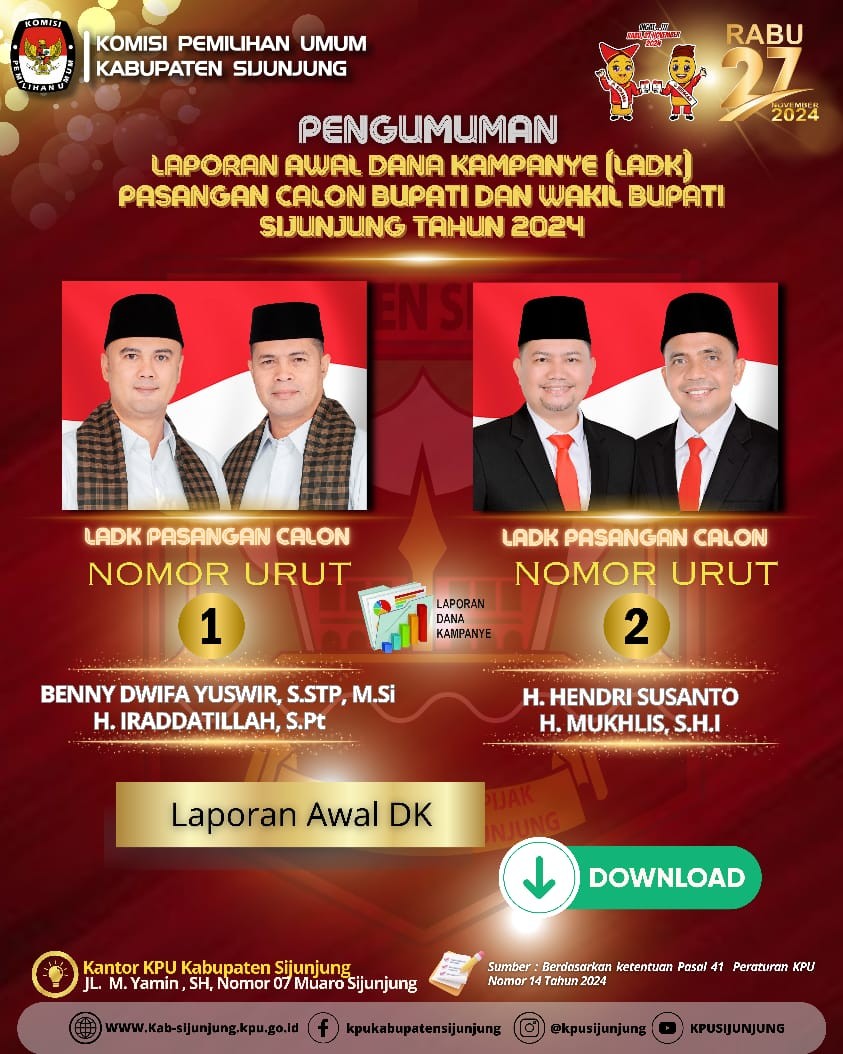 Sehubungan dengan hal tersebut diatas, KPU Kabupaten Sijunjung Mengumumkan Laporan Awal Dana Kampanye (LADK) Pasangan Calon Bupati dan Wakil Bupati Sijunjung Tahun 2024 sebagaimana tersebut dalam dokumen LADK pasangan Calon yang dapat diunduh dibawah ini..
