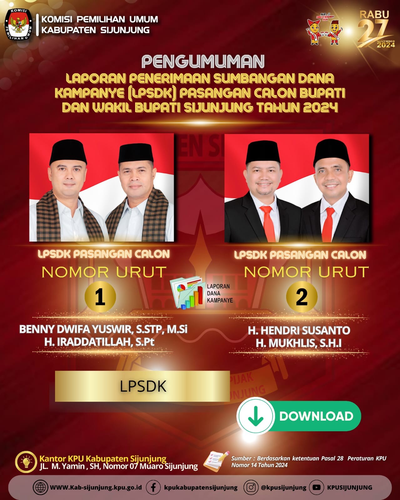 PENGUMUMAN LAPORAN PENERIMAAN SUMBANGAN DANA KAMPANYE PASANGAN CALON BUPATI DAN WAKIL BUPATI SIJUNJUNG TAHUN 2024