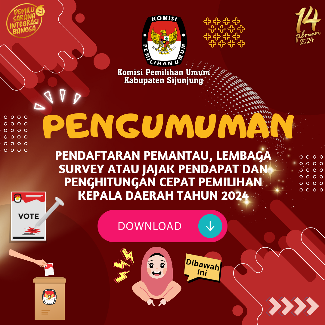 Berikut Kami Sampaikan Pengumuman Pendaftaran Pemantau, Lembaga Survey atau Jajak Pendapat dan Penghitungan Cepat Pemilihan Kepala Daerah Tahun 2024, yang dapat diunduh pada tautan dibawah ini..
