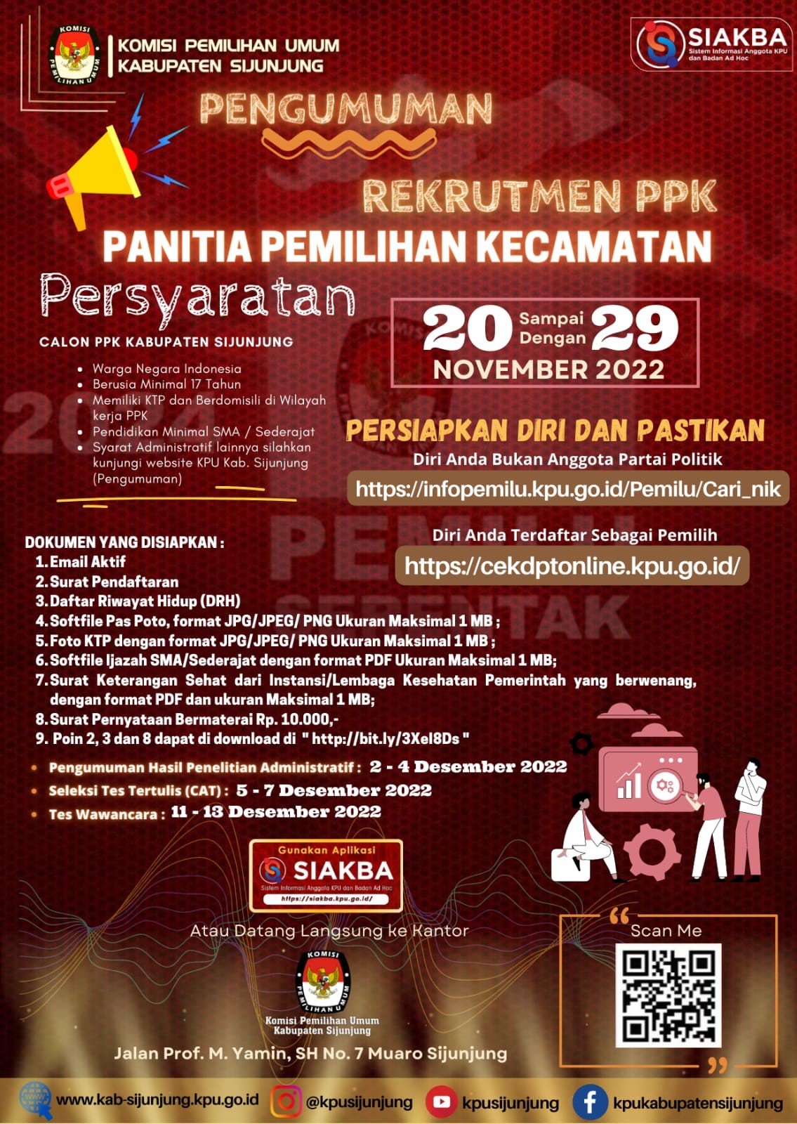 Muaro - KPU Kabupaten Sijunjung Menerima Pendaftaran Panitia Pemilihan Kecamatan (PPK) di Kabupaten sijunjung, yang dapat di Download pada tautan dibawah ini :