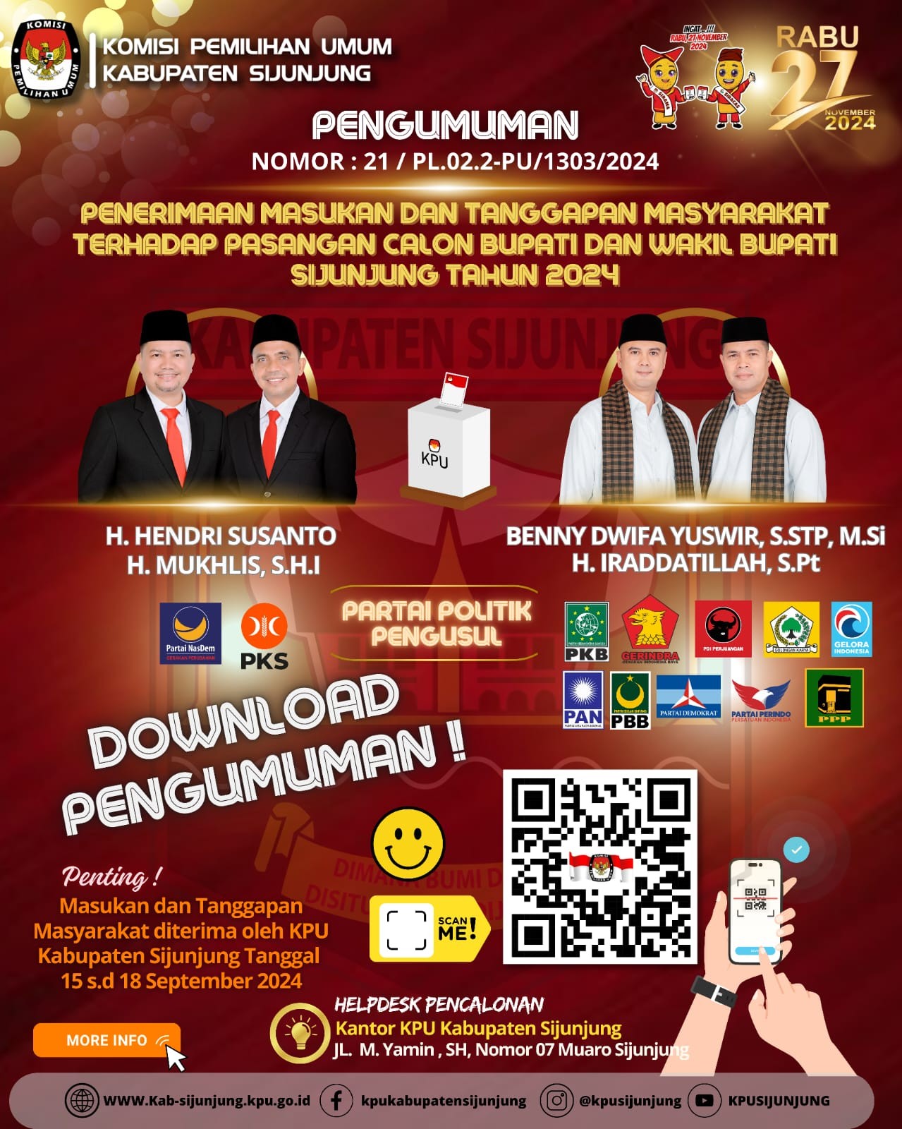 Bahwa untuk melaksanakan ketentuan Pasal 137 Peraturan KPU Nomor 8 Tahun 2024 tentang Pencalonan Gubernur dan Wakil Gubernur, Bupati dan Wakil Bupati, serta Walikota dan Wakil Walikota yang telah diubah dengan Peraturan KPU Nomor 10 Tahun 2024 tentang Perubahan Atas Peraturan KPU Nomor 8 Tahun 2024 tentang Pencalonan Gubernur dan Wakil Gubernur, Bupati dan Wakil Bupati, serta Walikota dan Wakil Walikota, Komisi Pemilihan Umum Kabupaten Sijunjung mengumumkan Penerimaan Masukan dan Tanggapan Masyarakat terhadap Pasangan Calon Bupati dan Wakil Bupati Kabupaten Sijunjung sebagai berikut... info lengkap, silahkan unduh Dokumen Pengumuman dan Form Tanggapan melalui tautan dibawah ini...