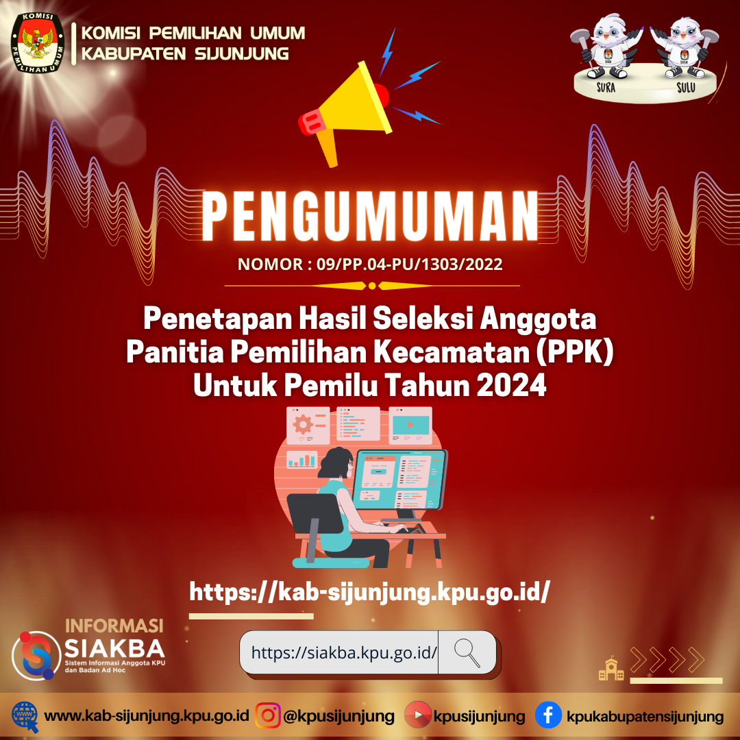 KPU Kabupaten Sijunjung Mengumumkan Penetapan Hasil Seleksi Anggota Panitia Pemilihan Kecamatan (PPK) Kabupaten Sijunjung Untuk Pemilihan Umum Tahun 2024. Pengumuman ini ditetapkan dalam rapat pleno pada Hari Jumat, Tanggal 16 Desember 2022 dengan nomor Berita Acara : 117/PK.01-BA/13O3|2O22 tentang Rapat Pleno Penetapan Hasil Seleksi Anggota Panitia Panitia Pemilihan Kecamatan (PPK) Pada Pemilu Tahun 2024, Hasil tersebut dituangkan dalam Pengumuman Nomor : 09/PP.04-PU/1303.2022 yang dapat di Download dibawah ini: