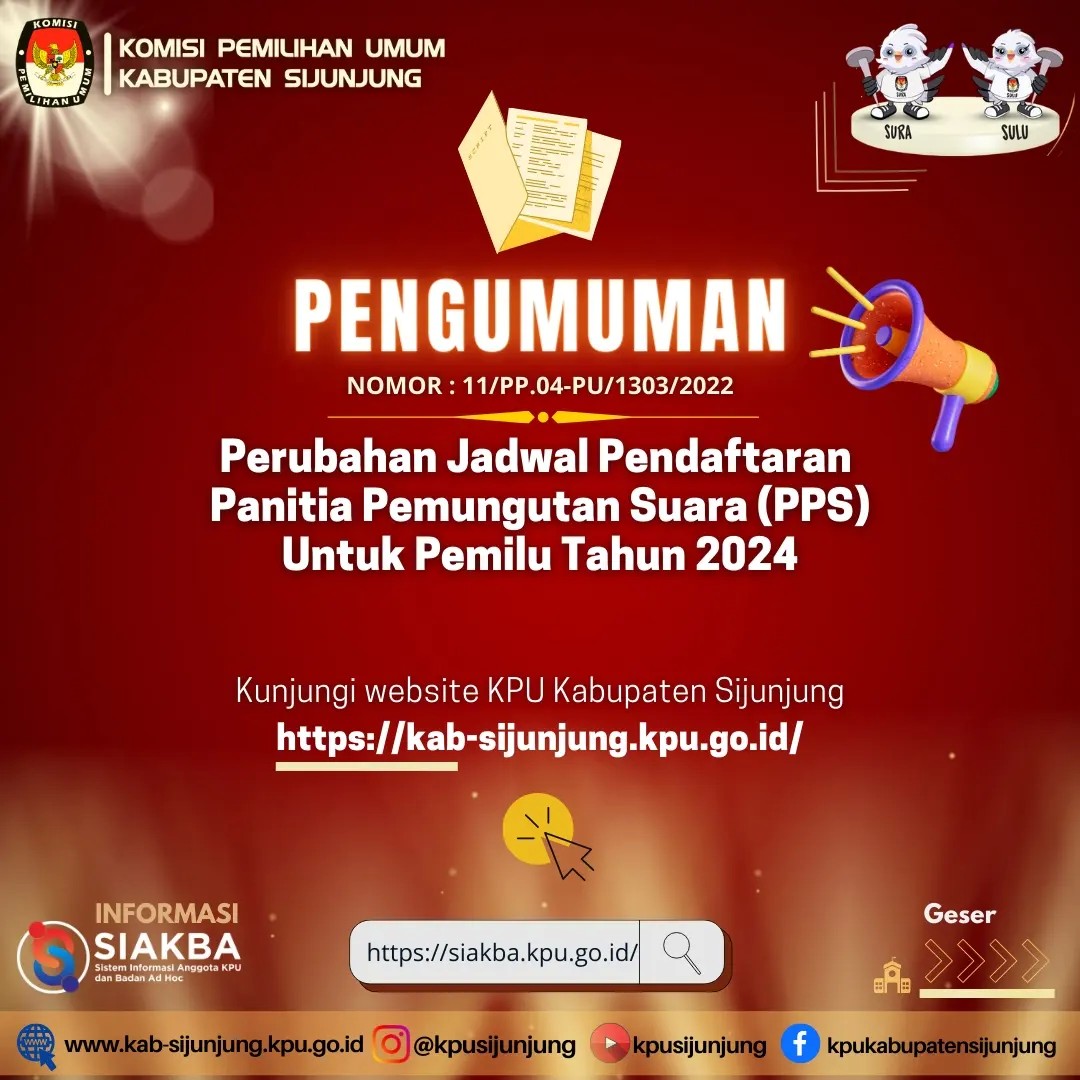 Berikut Kami Sampaikan perpanjangan Masa Pendaftaran Panitia Pemungutan Suara (PPS) Kabupaten Sijunjung untuk Pemilu Tahun 2024, pengumuman tersebut dapat didownload dibawah ini: