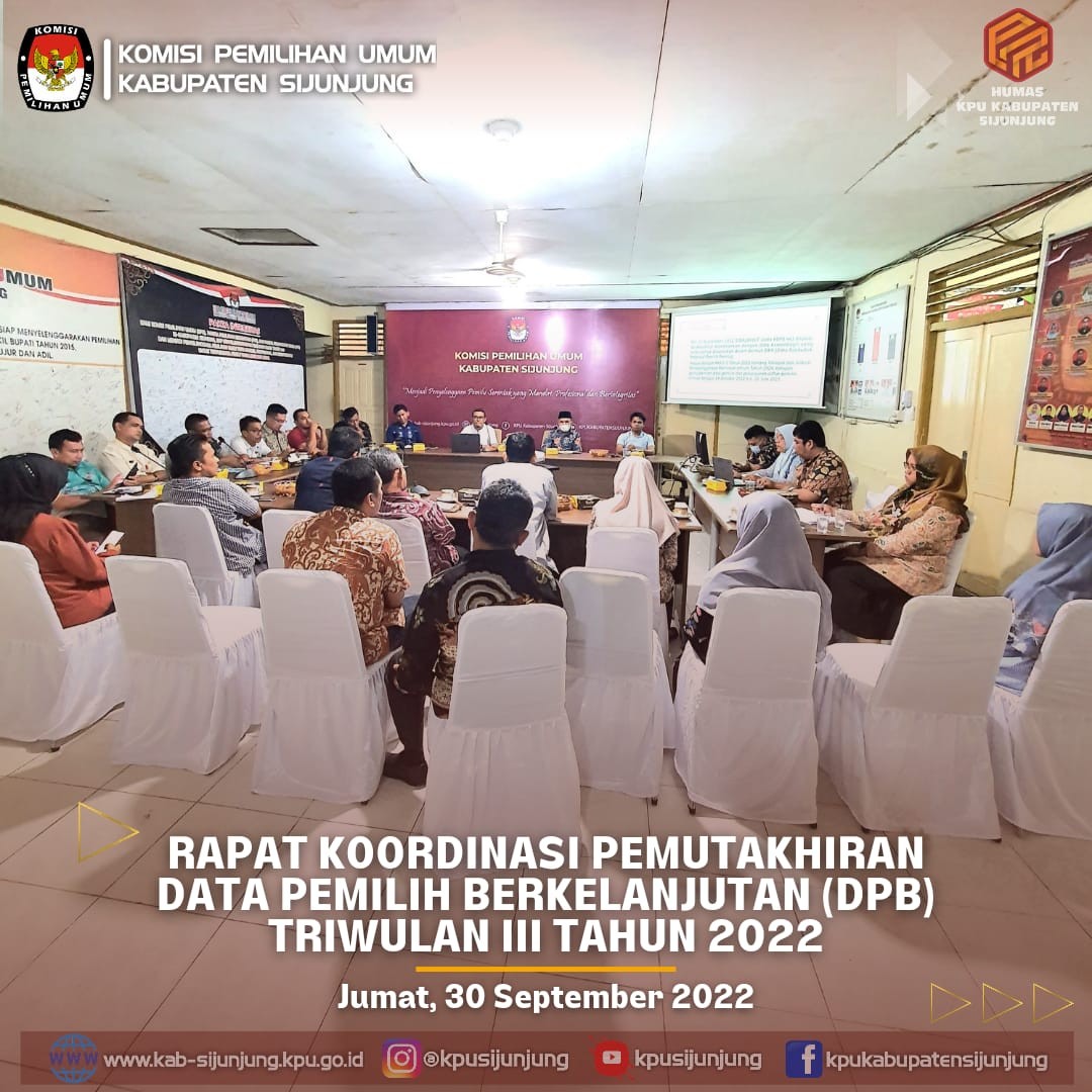 Muaro - KPU Kabupaten Sijunjung mengadakan Rapat Koordinasi (rakor) DPB Triwulan III Tahun 2022, Jumat (30/9).